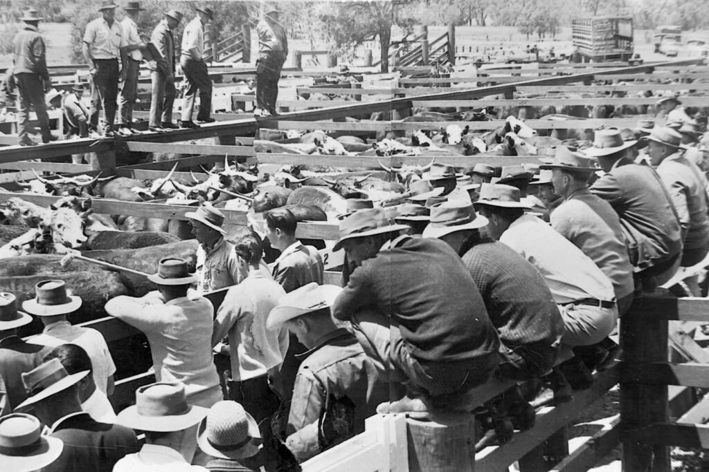 “A sale day at the Old Dip Saleyards probably the early 1960’s Tom Hair selling.”